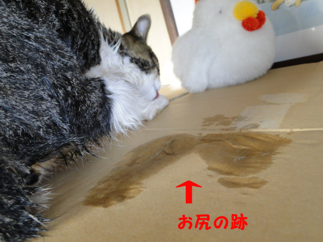 段ボールにしっかり残ったおしりの跡が(笑)