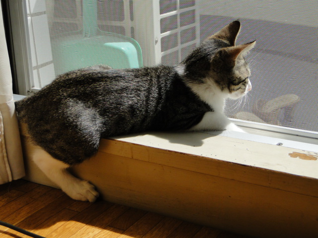 タオルドライの後、暖かい窓際へ移動。
