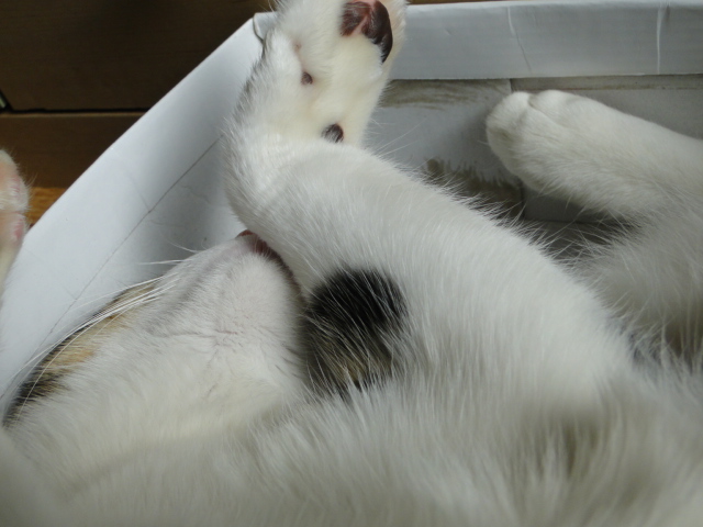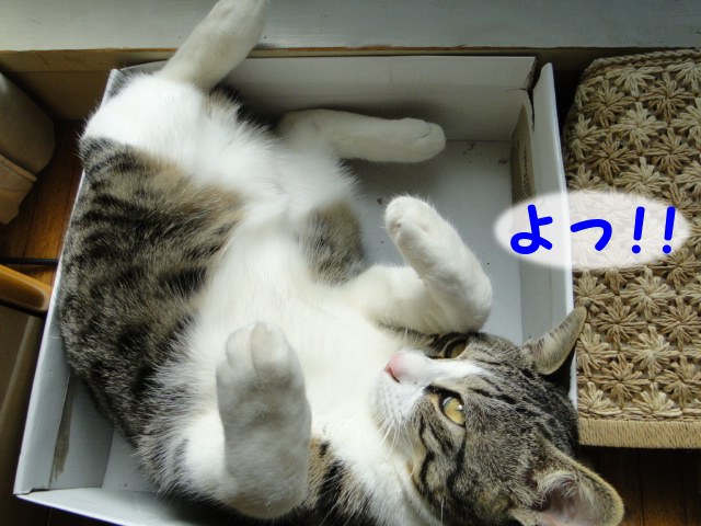 窓際の箱の中でゴロンゴロンしながら腹干しするお猫さま(笑)