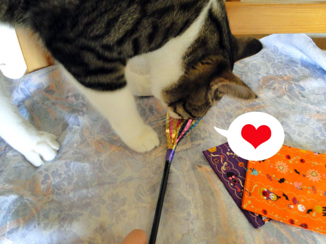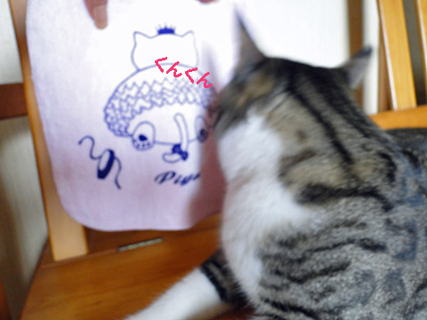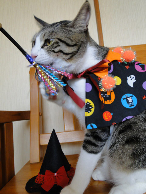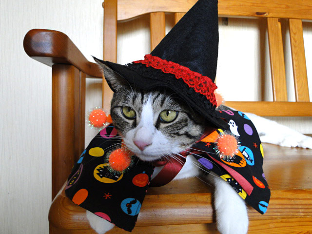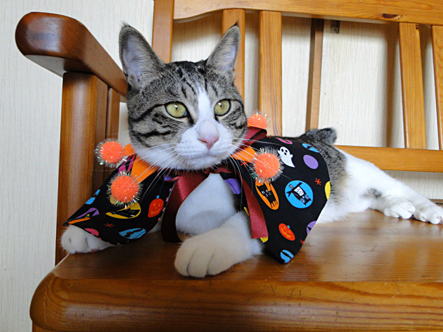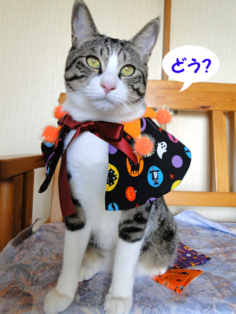 少しご機嫌になったお猫さまにマントをつけてみる♪