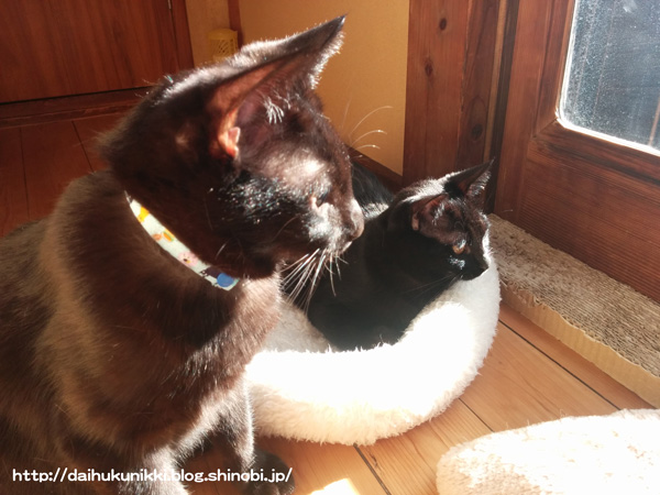ひなたぼっこしながら毛繕いするだいふく君。