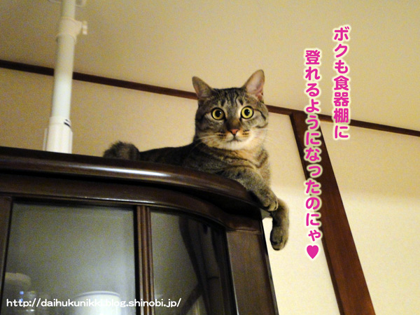 ずーっと憧れだった食器棚の上にも登れるようになりました〜♪