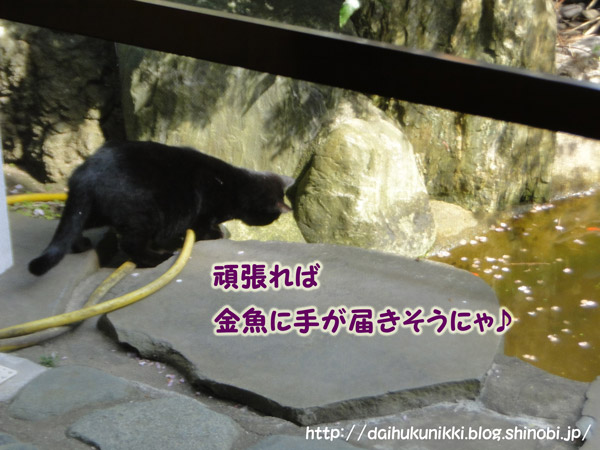 すあまに挨拶しそびれた黒猫さんは、のんびりと池に戻って金魚と戯れる(--;