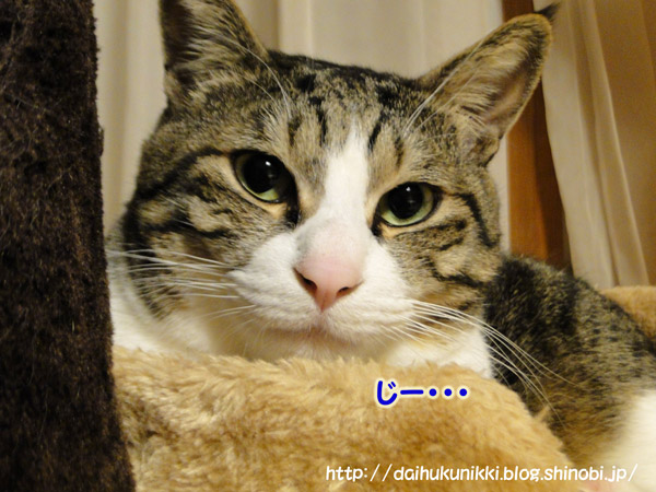 タワーの上からこちらをじーっと見つめるだいふく君。