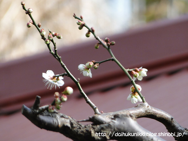 だいふく君の視線の先には咲いたばかりの梅の花♪