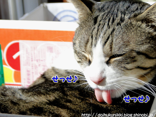 いつものように窓際で日向ぼっこしながら毛づくろいをするだいふく君。
