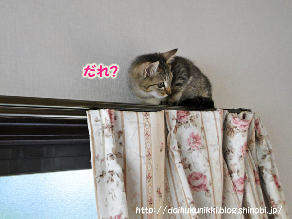 すあまちゃん、知らないオジサンの登場に驚いてカーテンレールに上がるw