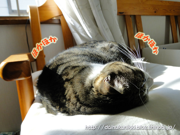 日当たりのいい窓際のクッションで日向ぼっこしながら微睡む だいふく君。