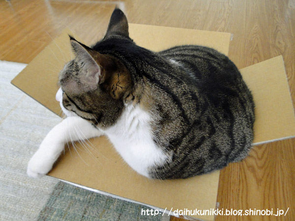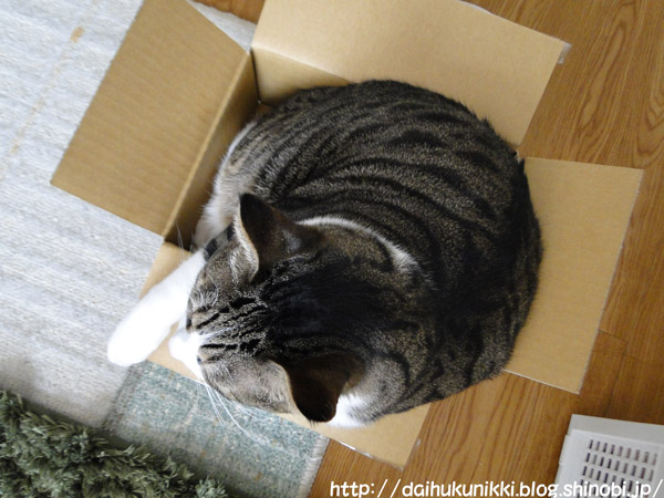 捨てようと思っていた箱で ちゃっかりで寛ぐ だいふく君。