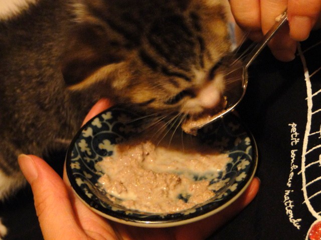 まず、お皿に仔猫用缶詰をミルクで薄めて目の前に置く。