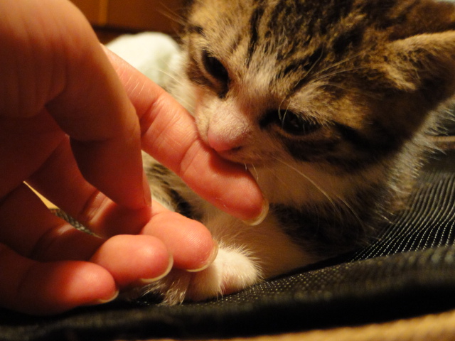 お腹が空いた時は 甘ったれた声を出しながら 指を甘噛みするのにゃ♪