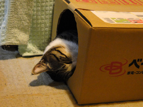 ホカペの上でしかも箱の中かなり気持ち良さそう~ちょっとだけ顔が出てるのがポイントだわー凄く可愛い!!