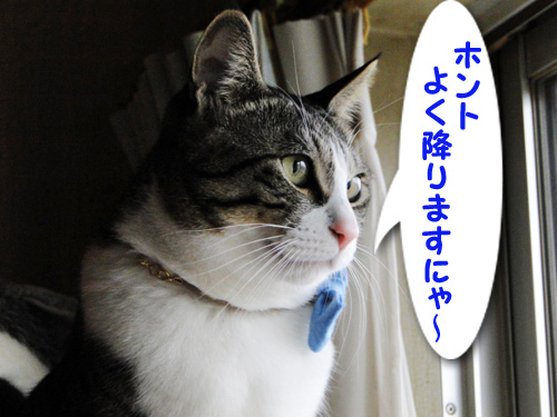 雨にも負けず風にも負けず、今日も元気に窓際警備するお猫さま。