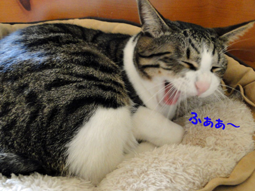 みいさん、アクビは眠い時にするんじゃなくてさぁ起きるぞって気合いを入れた時に出るんですって!