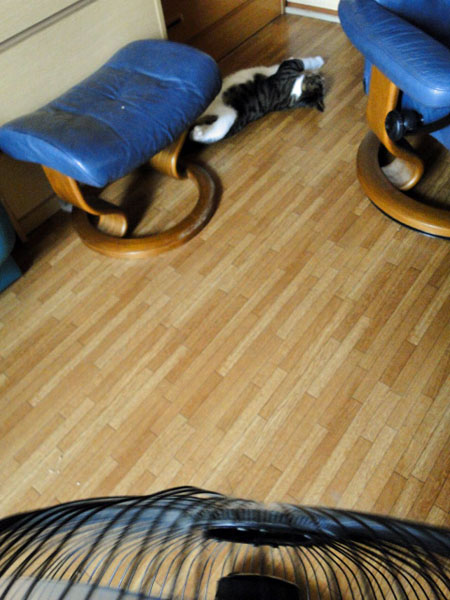 扇風機の風で腹毛がなびいて見た目も涼しげだし(笑)